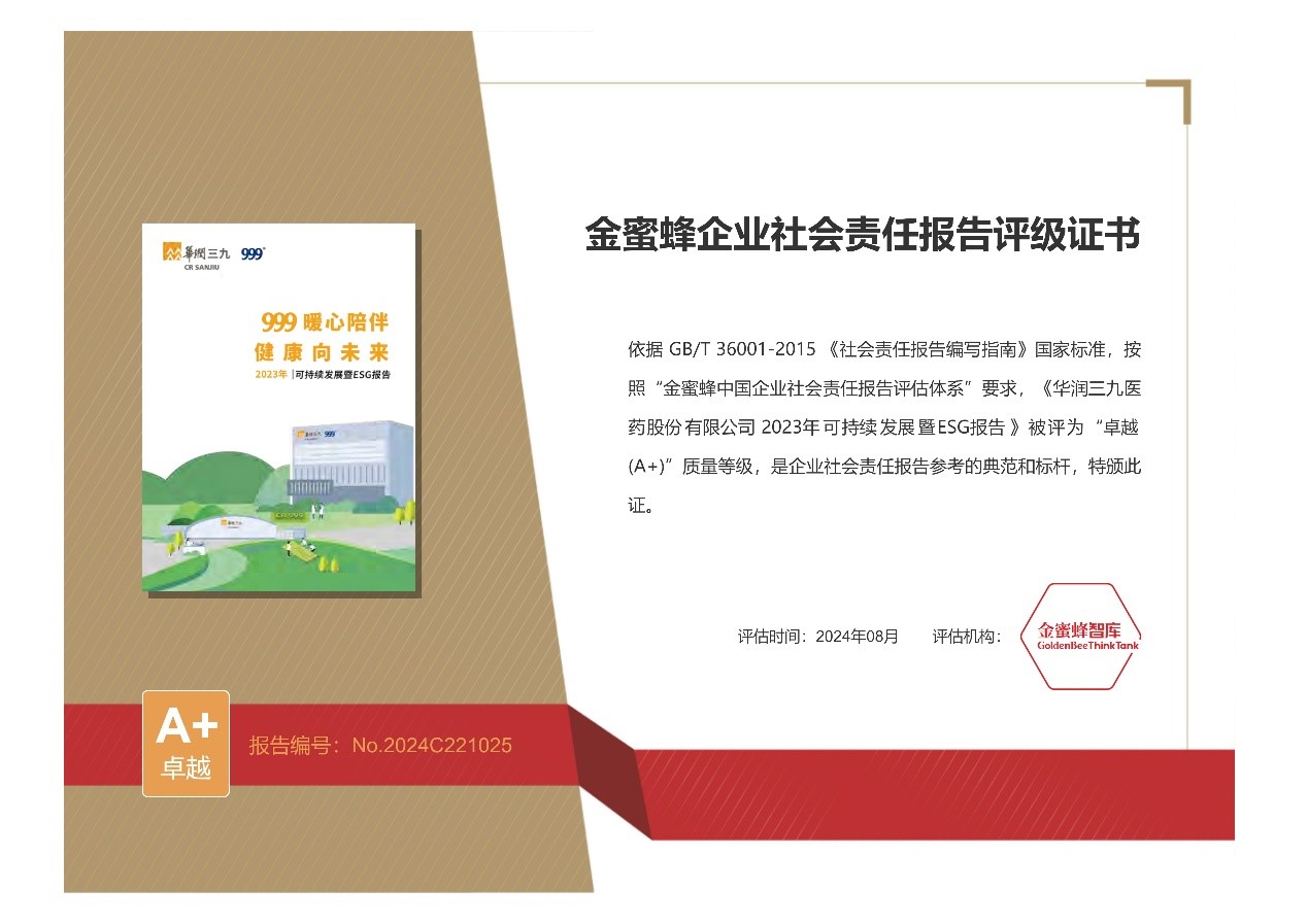 華潤三九獲金蜜蜂企業(yè)社會(huì)責(zé)任報(bào)告“卓越(A+)”評(píng)級(jí)