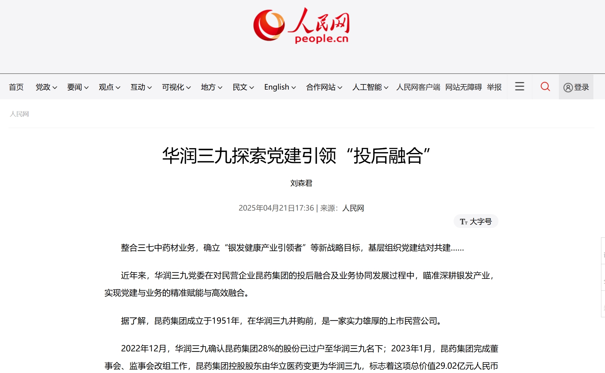 人民網(wǎng)報(bào)道華潤(rùn)三九探索黨建引領(lǐng)“投后融合”的實(shí)踐