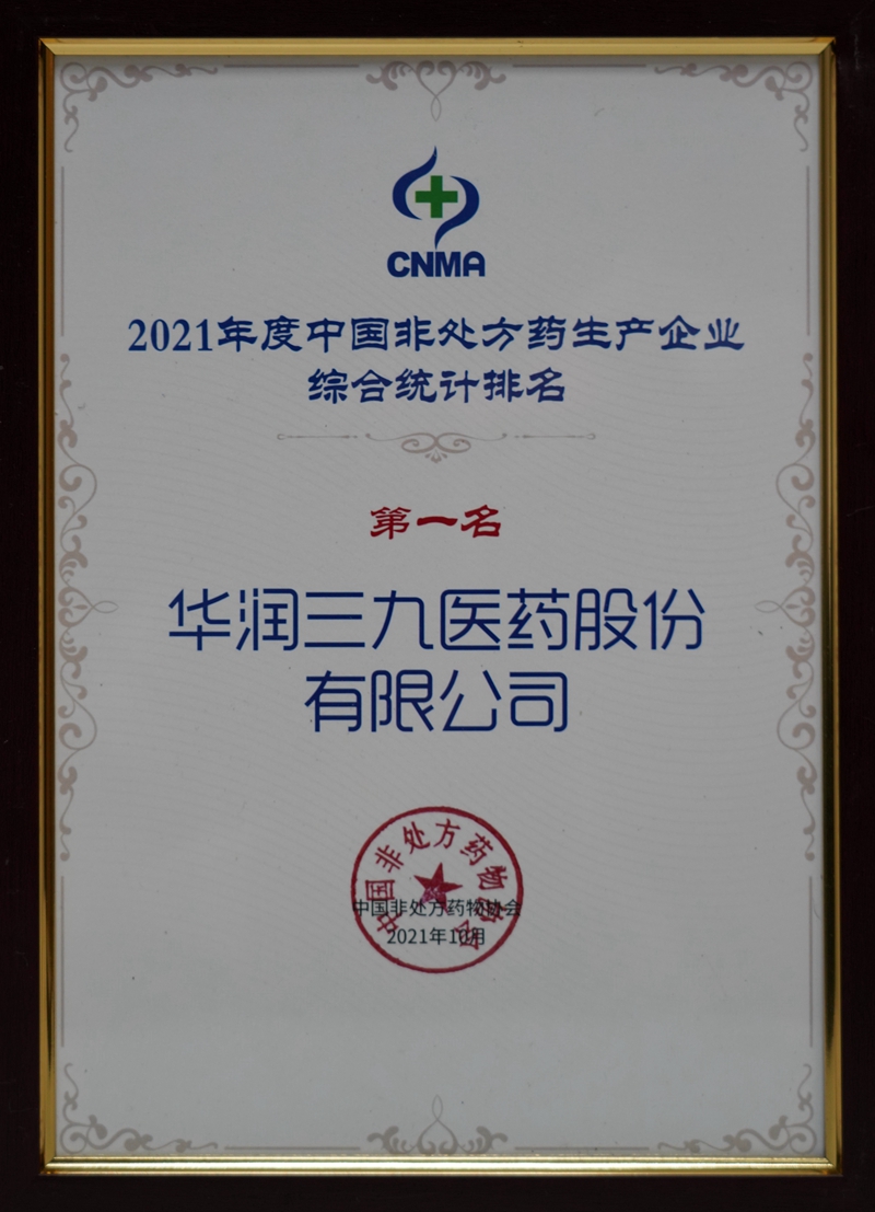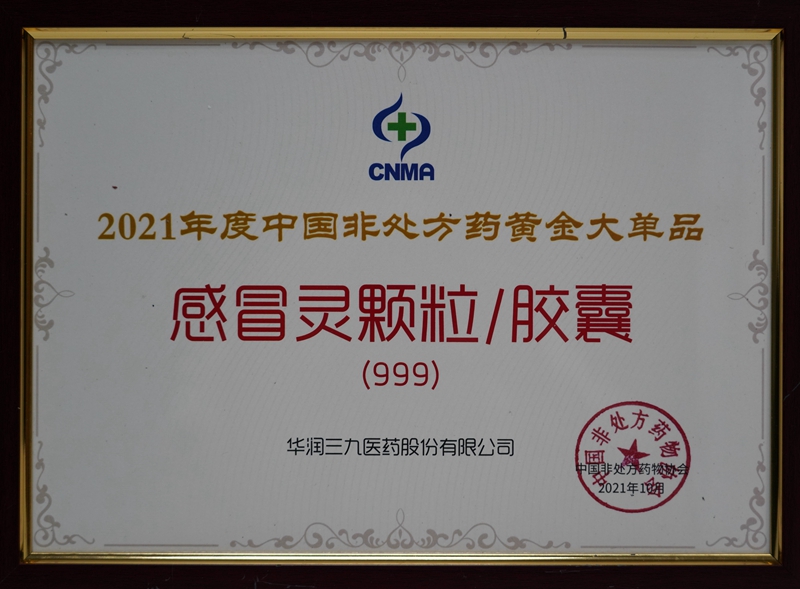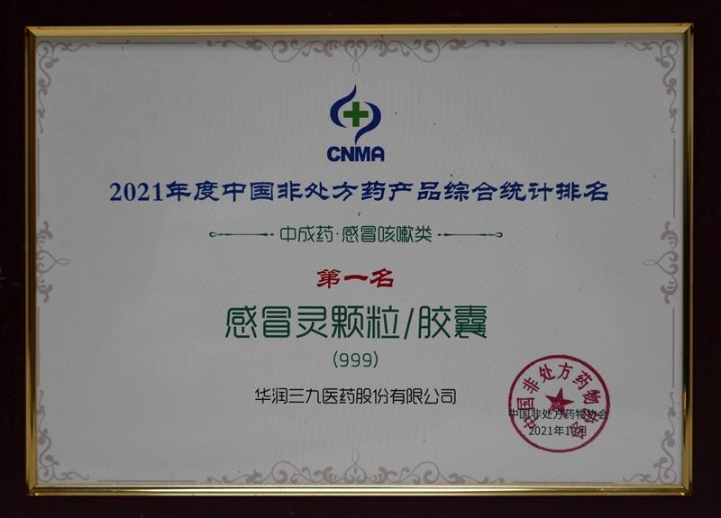 10月18-21日,2021健康中國-首屆中國OTC大會暨中國中醫(yī)藥促進(jìn)大會在廣州舉辦。會上發(fā)布了2021年度中國非處方藥生產(chǎn)企業(yè)綜合統(tǒng)計排名。華潤三九再次蟬聯(lián)中國非處方藥生產(chǎn)企業(yè)榜首,其中999感冒靈顆粒/膠囊連續(xù)十年榮獲感冒咳嗽類(中成藥)第一名,并入選”2021年度中國非處方藥黃金大單品名單”。