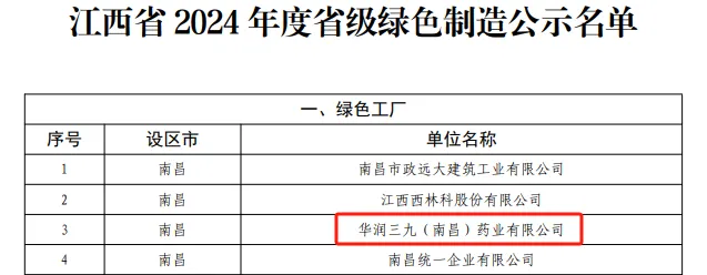 近日,江西省工業(yè)和信息化廳公布了江西省2024年度綠色制造體系名單,華潤三九(南昌)藥業(yè)有限公司獲評“省級綠色工廠”。