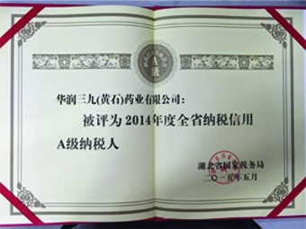 經(jīng)湖北省國家稅務局評定、審核,華潤三九(黃石)藥業(yè)有限公司被評定為2014年度A級納稅人。