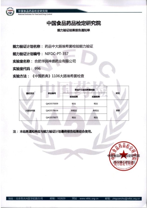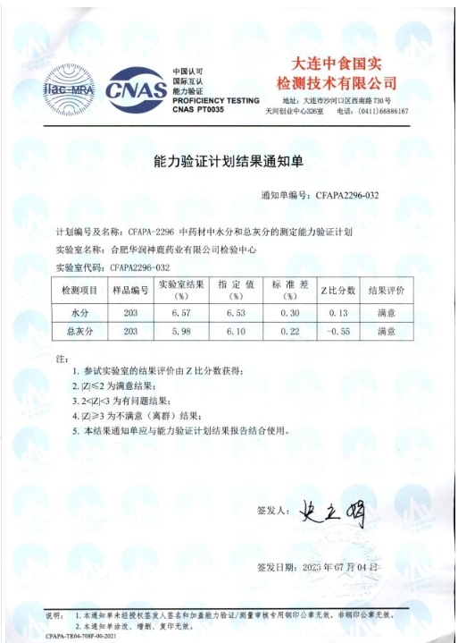 近日,在中國食品藥品檢定研究院公布的2023年的能力驗證計劃報告中,華潤神鹿檢驗中心參加的“藥品中霉菌和酵母菌總數(shù)計數(shù)能力驗證(NIFDC-PT-446)”及“藥品的比旋度測定能力驗證(NIFDC-PT-406)”分別榮獲滿意證書。大連中食國實檢測技術有限公司公布的2023年的能力驗證計劃報告中,華潤神鹿檢驗中心參加的“中藥材中水分和總灰分的測定能力驗證(CFAJPA-2296)”同樣榮獲滿意證書。上述四項滿意證書的獲得,標志著2023年華潤神鹿檢驗中心參加上述能力驗證項目全部通過,并連續(xù)5年通過能力驗證。